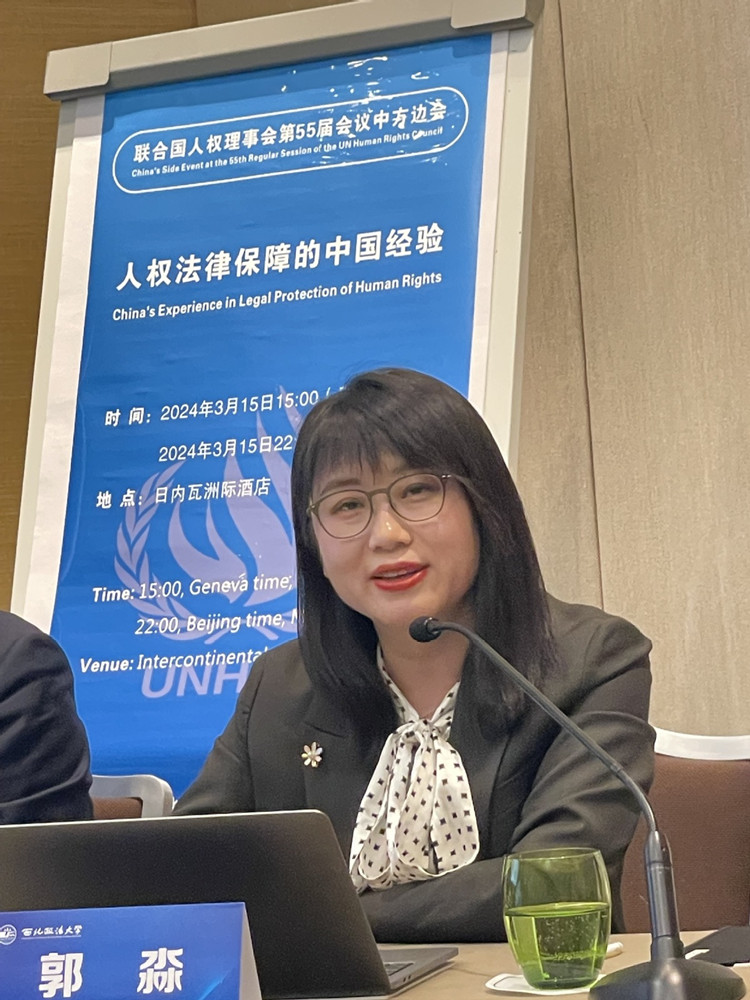 3月15日,在聯(lián)合國(guó)人權(quán)理事會(huì)第55屆會(huì)議期間,“人權(quán)法律保障的中國(guó)經(jīng)驗(yàn)”主題邊會(huì)在瑞士日內(nèi)瓦舉行。邊會(huì)由西北政法大學(xué)主辦,邀請(qǐng)來(lái)自國(guó)內(nèi)外的專家學(xué)者,就脫貧攻堅(jiān)、荒漠化治理、氣候變化、反恐怖主義、殘疾人體育權(quán)利等議題進(jìn)行交流探討。
