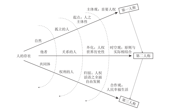 即以“人的存在”概念作為概念支點和體系原點,以自然、他者、共同體作為參考系,分別延展出第一、第二、第三人稱視角下的人權(quán)面相。在橫向上,可發(fā)散至四個階級:第一階級討論以人為中心比照三種參考系不同視角,明確體系發(fā)展方向。第二階級討論在人的存在中孵化、衍生出三個平臺認知形象,概括特征為孤立、關(guān)系與權(quán)利。第三階級討論將這一理解演進至人權(quán)體系內(nèi),突出表現(xiàn)在三個面相:人—人權(quán)—人權(quán)話語。第四階級進一步討論至更深層次的價值基礎(chǔ)與話語表征,從主體到時空至合作的遞進觀念,詮釋中國三個特色人權(quán)命題。在縱向上,從上至下可以在三個層面上進行理解:第一個層面在于視角的變換使得對“人的存在”認知視野逐漸擴大化、客觀化,第二個層面在于遞進關(guān)系,往往上層內(nèi)容是下層內(nèi)容的前提與支撐,外顯在人權(quán)的不同階段(起點、外化、歸宿);第三個層面在于觀念的承繼發(fā)展,從要求“生存發(fā)展”保障到“應(yīng)然實然”轉(zhuǎn)化再到“幸福生活”追求,反映出不同路徑下對人權(quán)發(fā)展的有效思考。