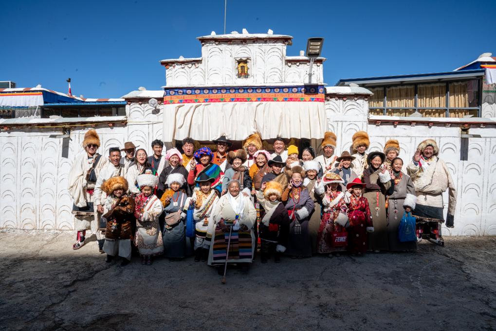在西藏拉薩市當(dāng)雄縣公塘鄉(xiāng)甲根村,斯曲旺姆(前中)和家人們一起拍攝全家福(2月10日攝)。新華社記者 丁增尼達 攝