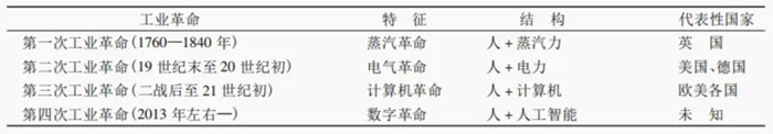 不少人可能認為,既然數(shù)字技術(shù)堪稱第四次工業(yè)革命,足見其影響之大。所謂第四次工業(yè)革命,系源于德國政府所提出的“工業(yè)4.0”規(guī)劃(Industrial 4.0),意指今天的數(shù)字技術(shù)革命,其意義堪比1760—1840年間的蒸汽革命、19世紀末至20世紀初的電氣革命和始于20世紀60年代的計算機革命,是一場新的工業(yè)革命。如果借助“人+力”的結(jié)構(gòu)加以觀察,四次工業(yè)革命可以概括如表1所示。