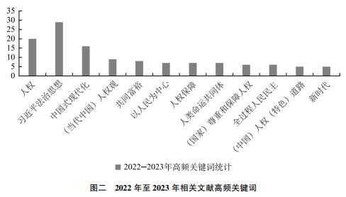 值得注意的是,除以上關鍵詞之外,另有部分關鍵詞雖未使用完全相同的表述,但從宏觀上可將其劃歸為同一研究范疇,因此,為全面展示2022-2023年主要的研究內(nèi)容,筆者對這些關鍵詞予以初步類型化,其大致分布在以下幾個方面:一是馬克思主義類,如馬克思主義、馬克思主義人權觀、馬克思主義基本立場、馬克思主義基本方法等。二是權利類,如生命權利、生存權、發(fā)展權、環(huán)境權等。三是特定群體權益類,老年人、殘疾人、婦女、未成年子女等。四是治理類,如國家治理效能、全球治理、人權治理、國家治理現(xiàn)代化等。五是價值類,如和諧發(fā)展、尊嚴、尊重、體面等。六是文化類,如文化自信、人權文化、國家文化軟實力。七是學科類,如人權學科、學科方向、新興學科、學科交叉融合(具體見表二)。