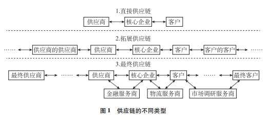 綜合學(xué)界對(duì)于供應(yīng)鏈的不同定義,供應(yīng)鏈可以被理解為商品或服務(wù)從原材料采購(gòu)到最終交付消費(fèi)者所涉及的一系列商業(yè)環(huán)節(jié)或價(jià)值鏈條,涉及商品原材料或零部件的制造商、供應(yīng)商、分銷商、零售商、運(yùn)輸商、信息和其他物流管理服務(wù)提供商到最終客戶等一系列實(shí)體(組織或個(gè)人)。與供應(yīng)鏈相關(guān)的概念是“價(jià)值鏈”。“價(jià)值鏈”是指產(chǎn)品或流程的整個(gè)生命周期,包括材料采購(gòu)、生產(chǎn)、消費(fèi)、處置和回收流程。因此,供應(yīng)鏈不僅是一條聯(lián)結(jié)從供應(yīng)商到消費(fèi)者的物流鏈、信息流鏈、資金鏈,而且是一條價(jià)值增值鏈。因此,供應(yīng)鏈與價(jià)值鏈在商品或服務(wù)流動(dòng)的各個(gè)環(huán)節(jié)存在一定的映射關(guān)系。如圖1所示,以核心企業(yè)為中心,供應(yīng)鏈網(wǎng)絡(luò)中的每條供應(yīng)鏈,根據(jù)其復(fù)雜程度和范圍長(zhǎng)度,可以分為三個(gè)層級(jí)或三種類型:直接供應(yīng)鏈(Direct Supply Chain)、拓展供應(yīng)鏈(Extended Supply Chain)和最終供應(yīng)鏈(Ultimate Supply Chain)。