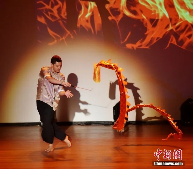 當(dāng)?shù)貢r間2024年5月10日,巴西巴西利亞,第23屆“漢語橋”世界大學(xué)生中文比賽巴西賽區(qū)比賽在巴西利亞大學(xué)啟幕。圖為選手表演彩帶龍。中新社記者 林春茵 攝