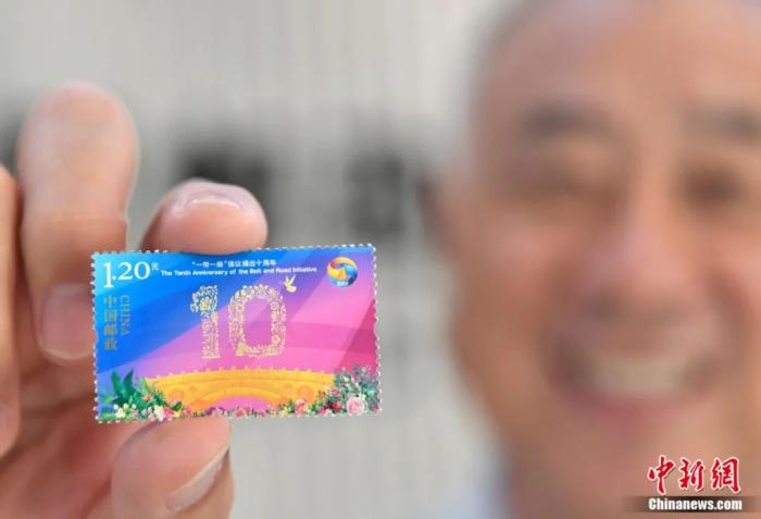 資料圖:2023年9月7日,山東濟南,一名集郵愛好者展示《“一帶一路”倡議提出十周年》紀念郵票。崔鵬森 攝
