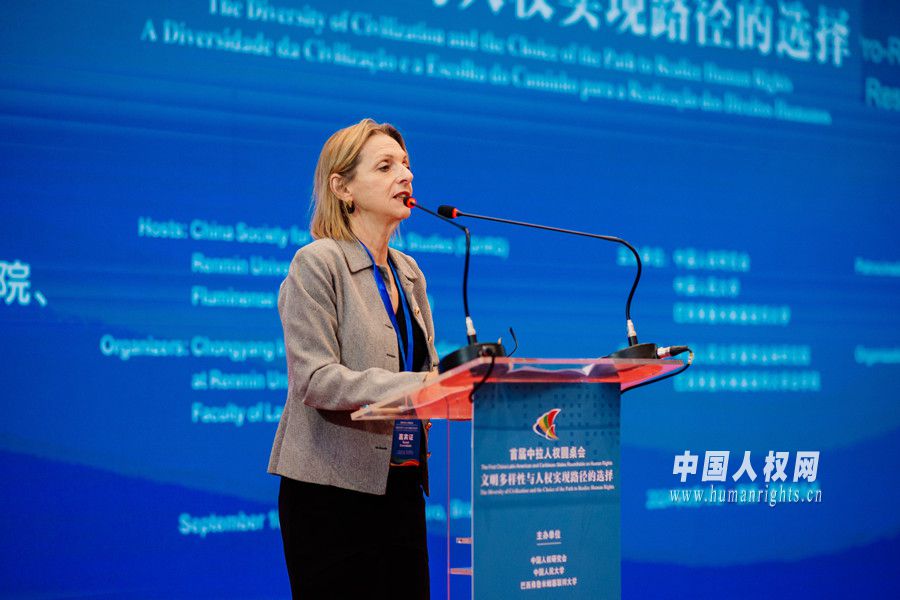 巴西弗魯米嫩塞聯(lián)邦大學(xué)副校長莫妮卡·薩維德拉在開幕式上致辭。她指出,該學(xué)府正在人權(quán)研究領(lǐng)域,與中國在內(nèi)的全球各個國家互動,“在當(dāng)前國際形勢之下,我們愿意推動全球人權(quán)研究領(lǐng)域的對話交流”。