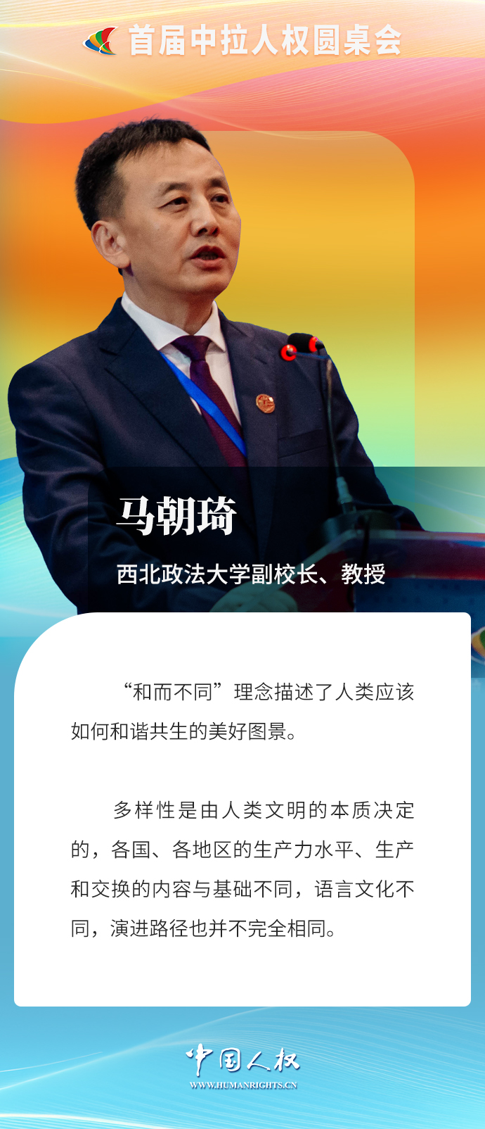 西北政法大學(xué)副校長(zhǎng)、教授馬朝琦作題為《“和而不同”理念與人類文明多樣性》的主旨發(fā)言。