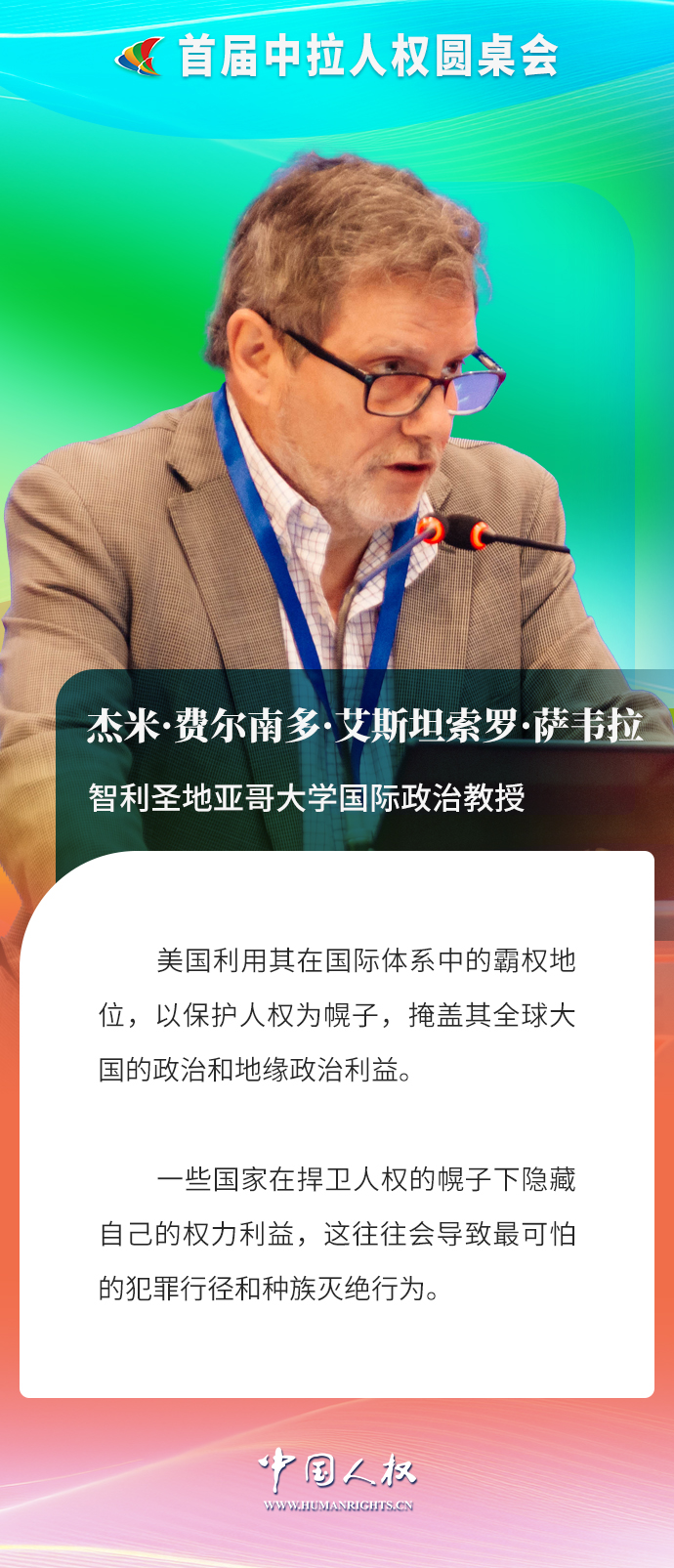 智利圣地亞哥大學(xué)國(guó)際政治教授杰米·費(fèi)爾南多·艾斯坦索羅·薩韋拉作題為《人權(quán)作為美國(guó)及其盟友控制和統(tǒng)治的工具》的主旨發(fā)言。