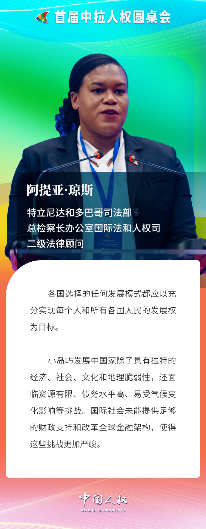 特立尼達(dá)和多巴哥司法部、總檢察長(zhǎng)辦公室國(guó)際法和人權(quán)司二級(jí)法律顧問(wèn)阿提亞·瓊斯作題為《實(shí)現(xiàn)小島嶼發(fā)展中國(guó)家的發(fā)展權(quán)和基本權(quán)利的享有》的主旨發(fā)言。