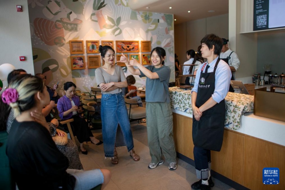6月16日,陳媛媛(右一)與其他聽障顧客交流。新華社記者 伍志尊 攝