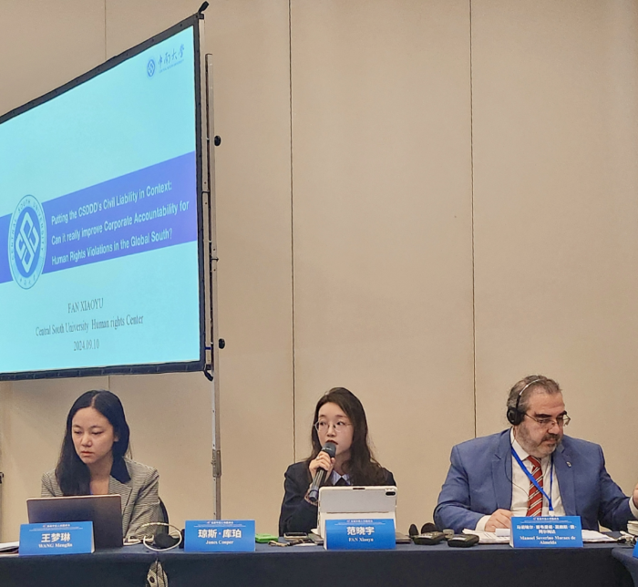 中南大學(xué)人權(quán)研究中心研究員范曉宇在分議題三“當(dāng)前全球人權(quán)治理面臨的挑戰(zhàn)與出路”上以“將歐盟《企業(yè)可持續(xù)發(fā)展盡職調(diào)查指令》(CSDDD)民事責(zé)任機(jī)制置于背景之下:它真的能推動(dòng)對(duì)侵犯全球南方人權(quán)的企業(yè)問責(zé)嗎?”她認(rèn)為,民事責(zé)任機(jī)制可能無法徹底解決權(quán)利人所面臨的救濟(jì)困境。CSDDD沒有解決程序障礙,特別是受影響的權(quán)利人與跨國公司在權(quán)力、信息和資源方面的能力不對(duì)稱問題。這將阻礙受害人將程序性救濟(jì)轉(zhuǎn)化為實(shí)質(zhì)性結(jié)果。與此同時(shí),民事責(zé)任機(jī)制給企業(yè)帶來沉重合規(guī)義務(wù)。CSDDD可能成為歐盟的新型單邊經(jīng)貿(mào)法律工具,刺激全球供應(yīng)鏈“去全球化”。對(duì)此,全球南方應(yīng)在國際舞臺(tái)上團(tuán)結(jié)一致捍衛(wèi)自身利益。供應(yīng)鏈人權(quán)盡責(zé)制度應(yīng)該妥善平衡發(fā)展權(quán)和人權(quán)之間的關(guān)系。