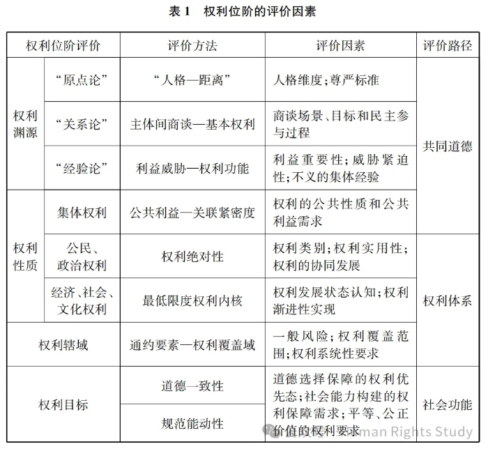 權(quán)利位階的構(gòu)建依托相應(yīng)理據(jù),這要求識(shí)別并界定權(quán)利位階的評(píng)價(jià)因素。如上所述,權(quán)利位階受制于國(guó)家的主觀觀念,社會(huì)制度、經(jīng)濟(jì)、文化等多元因素影響著對(duì)權(quán)利重要性的理解和規(guī)定,這是權(quán)利位階經(jīng)由主觀要素塑造所呈現(xiàn)出的“殊相”。與此同時(shí),權(quán)利位階無法脫離權(quán)利邏輯而直接確定,其必須遵循權(quán)利在實(shí)質(zhì)價(jià)值、權(quán)利關(guān)系、功能等方面所包含的規(guī)律性,這是權(quán)利位階基于客觀因素影響所表現(xiàn)出的“共相”。權(quán)利位階是契合權(quán)利客觀規(guī)律基礎(chǔ)上融合權(quán)利主觀觀念而產(chǎn)生的政策或規(guī)范現(xiàn)象,反過來,任何政策或規(guī)范層面的位階評(píng)價(jià)都依托特定主體對(duì)共、殊因素的鑒別與認(rèn)可。權(quán)利位階的評(píng)價(jià)因素見表1。