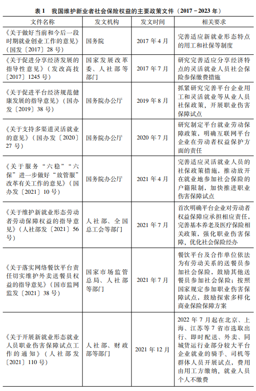 2021年7月發(fā)布的《指導(dǎo)意見(jiàn)》主要從“完善社會(huì)保險(xiǎn)政策、強(qiáng)化職業(yè)傷害保障和優(yōu)化社會(huì)保險(xiǎn)經(jīng)辦”三個(gè)方面完善了新業(yè)者社保權(quán)益維護(hù)機(jī)制,并以“能否確立勞動(dòng)關(guān)系”為標(biāo)準(zhǔn)采用“三分法”的創(chuàng)新思路重構(gòu)了新業(yè)者社保政策體系:一是對(duì)“符合確立勞動(dòng)關(guān)系情形者”強(qiáng)調(diào)督促所屬企業(yè)依法參加社會(huì)保險(xiǎn);二是對(duì)“不完全符合確立勞動(dòng)關(guān)系情形者”強(qiáng)調(diào)企業(yè)要“引導(dǎo)和支持”新業(yè)者根據(jù)自身情況參加相應(yīng)的社會(huì)保險(xiǎn);三是對(duì)“從事自由職業(yè)者”強(qiáng)調(diào)放開(kāi)參保的戶籍限制并允許其在職工和居民的社會(huì)保險(xiǎn)之間選擇參保以做到應(yīng)保盡保(見(jiàn)表1)。