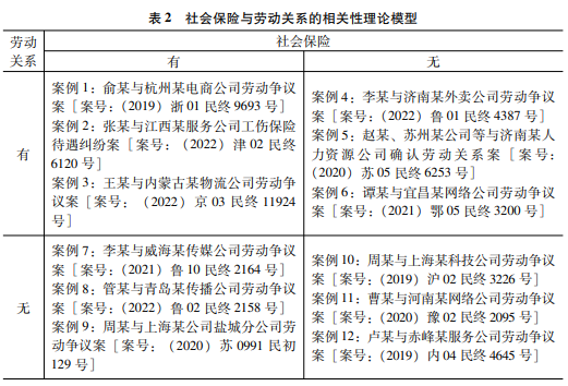 在新的研究框架下,如果單純從理論層面推演,新業(yè)者社保與勞動(dòng)關(guān)系的相關(guān)性應(yīng)該存在四種不同的組合(簡(jiǎn)稱(chēng)理論模型,見(jiàn)表2):一是“有勞動(dòng)關(guān)系+有社會(huì)保險(xiǎn)”;二是“有勞動(dòng)關(guān)系+無(wú)社會(huì)保險(xiǎn)”;三是“無(wú)勞動(dòng)關(guān)系+有社會(huì)保險(xiǎn)”;四是“無(wú)勞動(dòng)關(guān)系+無(wú)社會(huì)保險(xiǎn)”。當(dāng)然,理論模型能否“刻畫(huà)”新業(yè)者社保權(quán)益維護(hù)的真實(shí)狀貌尚需實(shí)證檢驗(yàn)。下面,從中國(guó)裁判文書(shū)網(wǎng)上選取了12個(gè)新業(yè)者社保權(quán)益維護(hù)的司法案例,運(yùn)用理論模型進(jìn)行歸類(lèi)考察。為保證案例具有代表性,選取過(guò)程中考慮了時(shí)間跨度和地域分布,其時(shí)間跨度為2019年至2022年,地域分布在北京、上海、天津、浙江、山東、江蘇、河南、湖北、內(nèi)蒙古等9個(gè)省域。