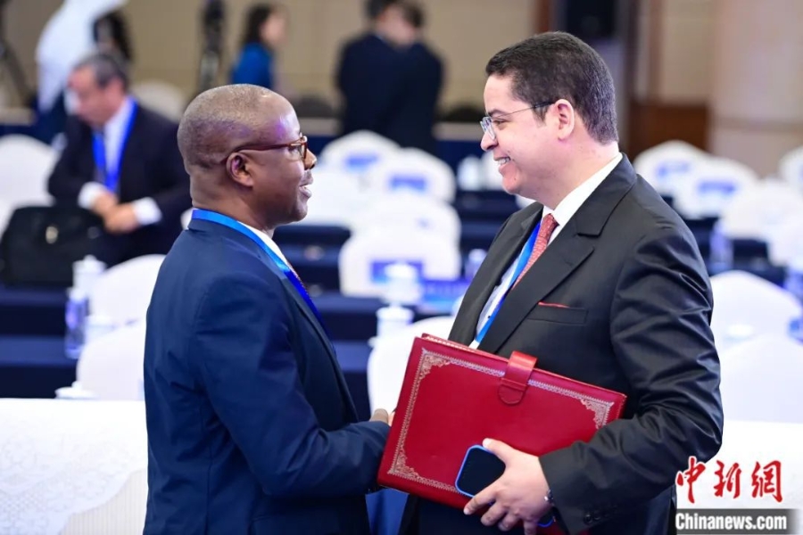 2023年12月5日,“紀(jì)念《世界人權(quán)宣言》發(fā)表75周年”國際研討會在北京舉行。圖為與會嘉賓在會后交流。中新社記者 田雨昊 攝
