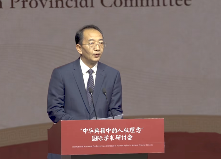 湖南省委常委、省委宣傳部部長(zhǎng)楊浩東在“中華典籍中的人權(quán)理念”國(guó)際學(xué)術(shù)研討會(huì)開(kāi)幕式上致辭。(圖片由會(huì)議主辦方提供)