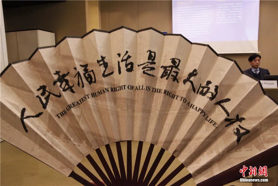 當(dāng)?shù)貢r間2024年3月14日,在聯(lián)合國人權(quán)理事會第55屆會議期間,中國人權(quán)研究會在日內(nèi)瓦舉辦主題邊會。圖為會議紀(jì)念品中國折扇,上寫“人民幸福生活是最大的人權(quán)”。中新社記者 德永健 攝