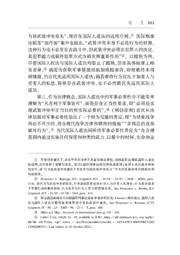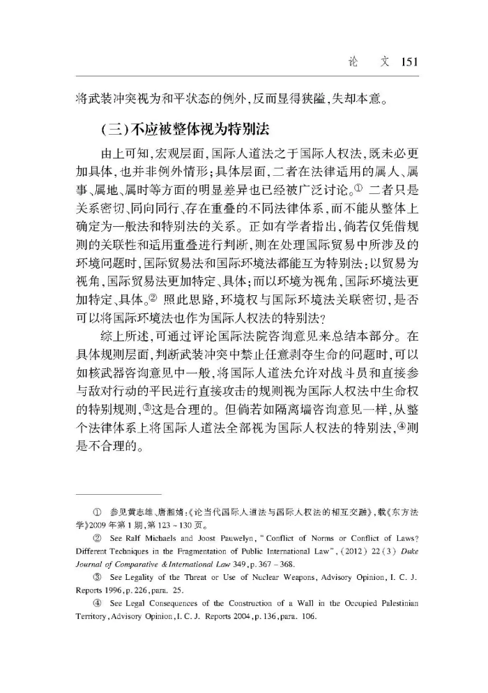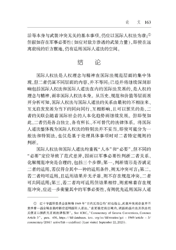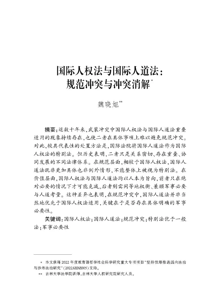 【摘要】近數(shù)十年來,武裝沖突中國際人權(quán)法與國際人道法重疊適用的現(xiàn)象持續(xù)存在,也使二者在具體事項上難以避免規(guī)范沖突。對此,較具代表性的處置方法是,國際法院將國際人道法作為國際人權(quán)法的特別法。但歷史表明,二者只是關(guān)系密切、存在重疊、協(xié)同發(fā)展的不同法律體系。在規(guī)范層面,相較于國際人權(quán)法,國際人道法既非更加具體也非例外情形,不能整體上被視為特別法。在價值層面,國際人權(quán)法與國際人道法均以人本為旨向,前者只在絕對必要的情況下才可能克減,后者則需同等地權(quán)衡、兼顧軍事必要與人道考量。這種差異也表明,在規(guī)范沖突中,國際人道法并非當然地優(yōu)先于國際人權(quán)法適用,關(guān)鍵在于是否存在具體明確的軍事必要性。