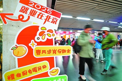 日前,旅客和求職者經(jīng)過北京西站“來京就業(yè)直通車”專場(chǎng)招聘會(huì)指示牌。新華社發(fā)