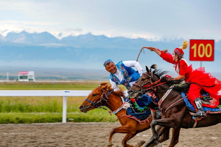 2024年7月10日,新疆代表團(tuán)運(yùn)動(dòng)員在新疆昭蘇參加表演項(xiàng)目競(jìng)技類“姑娘追”比賽。新華社記者 陳朔 攝