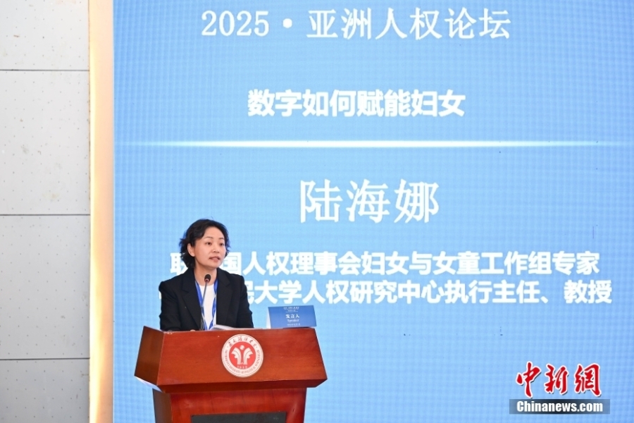 4月19日,2025·亞洲人權論壇在位于重慶市的西南政法大學開幕,來自中國、日本、蒙古國、烏茲別克斯坦等國家的近60位人權專家,通過線上線下方式,聚焦“科技與人權”主題,探討如何推動亞洲國家在科技人權領域的合作與創(chuàng)新。圖為聯(lián)合國人權理事會婦女與女童工作組專家,中國人民大學人權研究中心執(zhí)行主任、教授陸海娜在論壇上作主旨發(fā)言。中新社記者 何蓬磊 攝