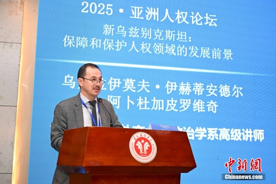 4月19日,2025·亞洲人權論壇在位于重慶市的西南政法大學開幕,來自中國、日本、蒙古國、烏茲別克斯坦等國家的近60位人權專家,通過線上線下方式,聚焦“科技與人權”主題,探討如何推動亞洲國家在科技人權領域的合作與創(chuàng)新。圖為世界經(jīng)濟與外交大學政治學系高級講師烏夫拉伊莫夫·伊赫蒂安德爾·阿卜杜加皮羅維奇在論壇上作主旨發(fā)言。中新社記者 何蓬磊 攝