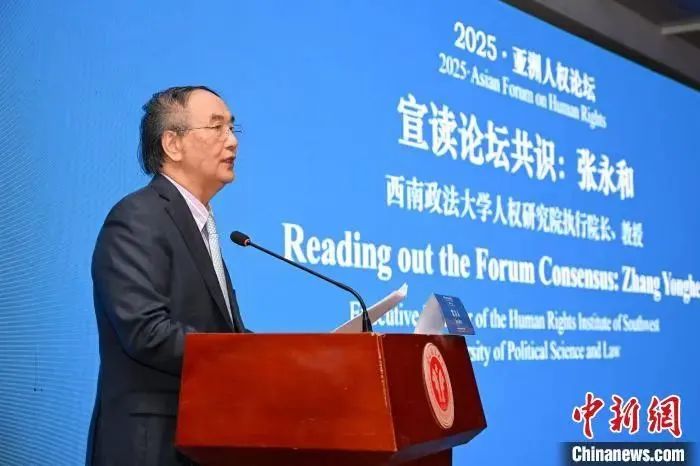 4月20日,2025·亞洲人權論壇在西南政法大學閉幕。圖為西南政法大學人權研究院(人權學院)執(zhí)行院長張永和宣讀“亞洲人權論壇”重慶共識。中新社記者 何蓬磊 攝