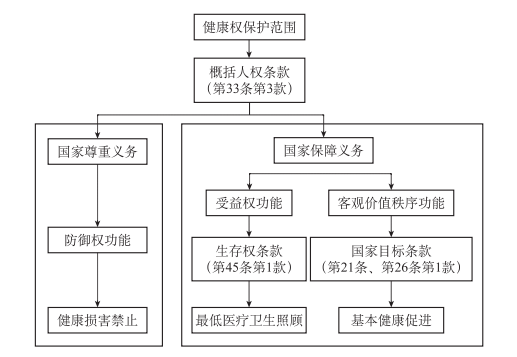 最早在國際人權(quán)法中,健康權(quán)保護(hù)范圍被劃分為由保護(hù)客體和保護(hù)水平組成的規(guī)范結(jié)構(gòu)。國際人權(quán)法對(duì)健康權(quán)的抽象宣示經(jīng)過國內(nèi)部門法的轉(zhuǎn)化,又被具體列示為以權(quán)利、權(quán)益、法益、水平為代表的不同健康保護(hù)內(nèi)容。而到了國家憲法的抽象概括層面,健康權(quán)作為基本權(quán)利,超越了不同部門法對(duì)健康權(quán)的認(rèn)識(shí)分歧,通過不同類型的國家義務(wù)建構(gòu)而得以界定其應(yīng)有的規(guī)范內(nèi)涵。