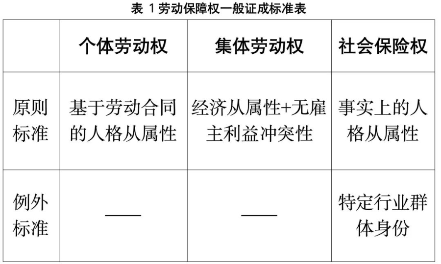需要首先指出的是,當(dāng)前有關(guān)新業(yè)態(tài)群體勞動(dòng)保障權(quán)證成標(biāo)準(zhǔn)的觀點(diǎn),都以假定存在一元化的證成標(biāo)準(zhǔn)為前提。然而,當(dāng)檢視國內(nèi)外相關(guān)具體規(guī)定時(shí),卻不難發(fā)現(xiàn),出于不同的立法目的,諸如個(gè)體勞動(dòng)法、集體勞動(dòng)法和社會(huì)保險(xiǎn)法等具體勞動(dòng)保障法,采取了多元的勞動(dòng)保障權(quán)證成標(biāo)準(zhǔn)。故而,不能簡單地認(rèn)為,新業(yè)態(tài)群體會(huì)因一元化的證成標(biāo)準(zhǔn),而享有或不享有勞動(dòng)保障權(quán)。相反,這需要根據(jù)不同的勞動(dòng)保障法律條文,分別從個(gè)體勞動(dòng)權(quán)、集體勞動(dòng)權(quán)和社會(huì)保險(xiǎn)權(quán)三個(gè)方面,予以具體分析。