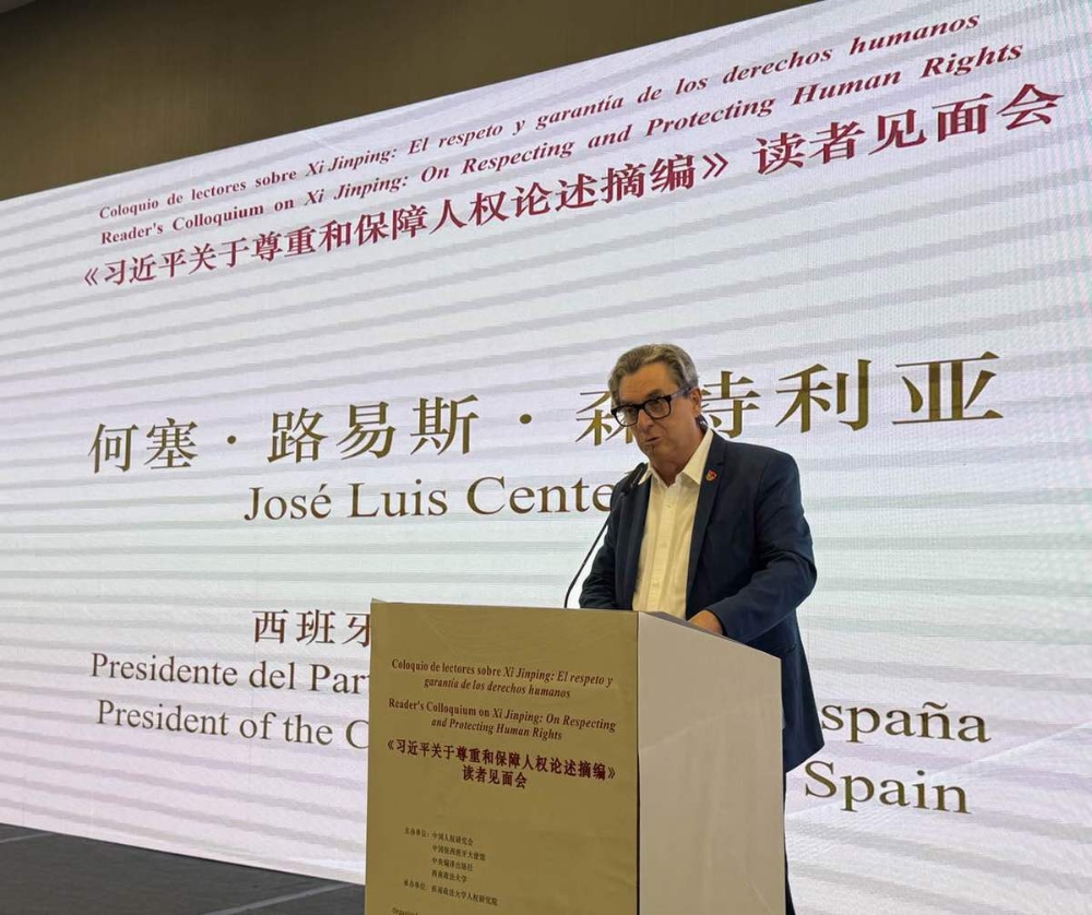 中國駐西班牙大使姚敬、西班牙共產(chǎn)黨主席何塞·路易斯·森特利亞(Jose Luis Centella)、西南政法大學(xué)校長林維、中央編譯出版社社長郗衛(wèi)東等嘉賓出席并致辭。80余位來自政治、經(jīng)濟(jì)、文化等領(lǐng)域的中西專家、學(xué)者、社會組織負(fù)責(zé)人、友華人士出席會議。