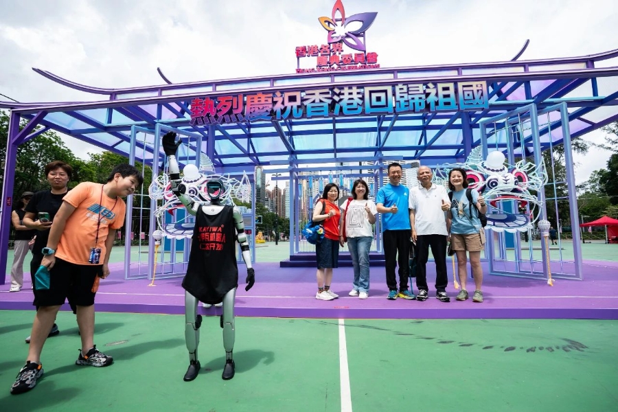 2025年6月29日,由香港各界慶典委員會主辦的“維園慶回歸”活動在香港維多利亞公園開幕,慶祝香港回歸祖國28周年和香港特別行政區(qū)成立28周年。圖為人形機器人與市民游客互動。 中新社記者 侯宇 攝