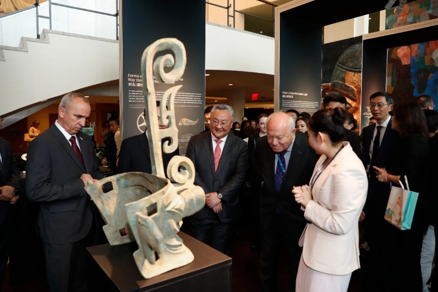 當?shù)貢r間2025年6月9日,中國在紐約聯(lián)合國總部舉辦“文明對話國際日”主題活動,包括主題對話會、文明交流互鑒長卷展覽以及“跨越山海的文明對話”文藝演出等。圖為參觀者參觀文明交流互鑒長卷展覽。中新社記者 廖攀 攝