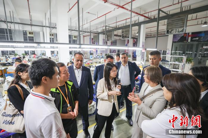 2023年11月6日,2023上合組織國家扶貧研修班(江西)開班,來自烏茲別克斯坦、吉爾吉斯斯坦、哈薩克斯坦三國的政府官員在江西一體育用品生產(chǎn)企業(yè)車間了解就業(yè)幫扶、技能培訓(xùn)等情況。中新社記者 劉力鑫 攝