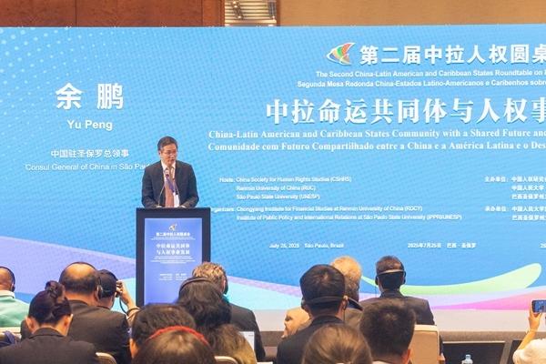 7月25日,巴西圣保羅, 中國駐圣保羅總領(lǐng)事余鵬在第二屆中拉人權(quán)圓桌會(huì)開幕式上致辭。主辦方供圖