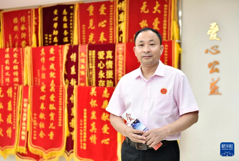 8月5日,徐軍在臨沂市手牽手孤困兒童心理輔導(dǎo)志愿服務(wù)團(tuán)的錦旗前留影。新華社記者 郭緒雷 攝