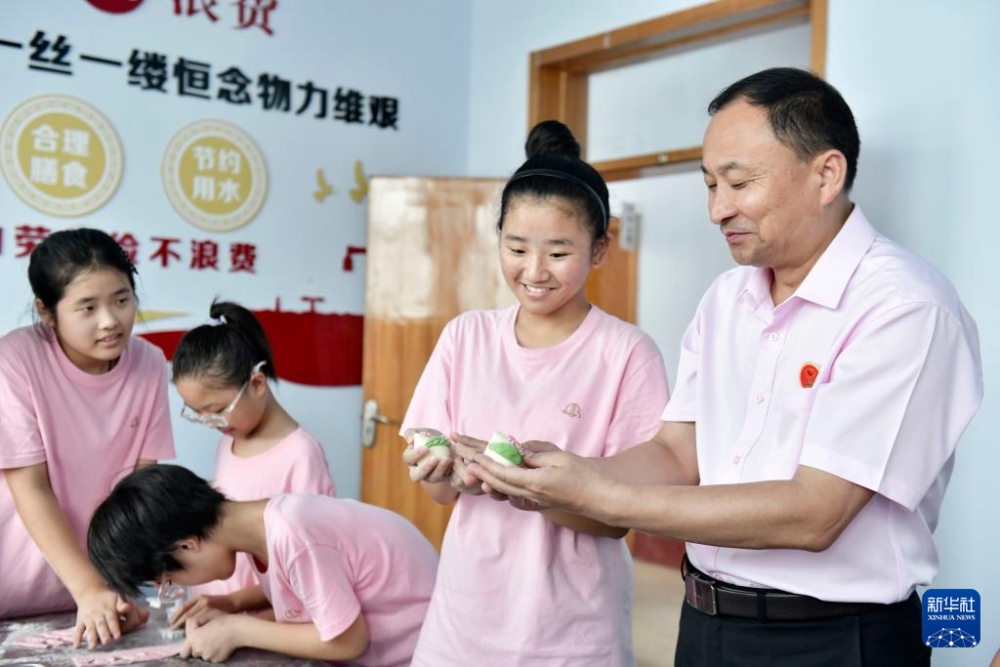 8月5日,在臨沂市臨沭縣孤困兒童心靈家園,徐軍(右一)和孩子們一起做面點(diǎn)。新華社記者 郭緒雷 攝