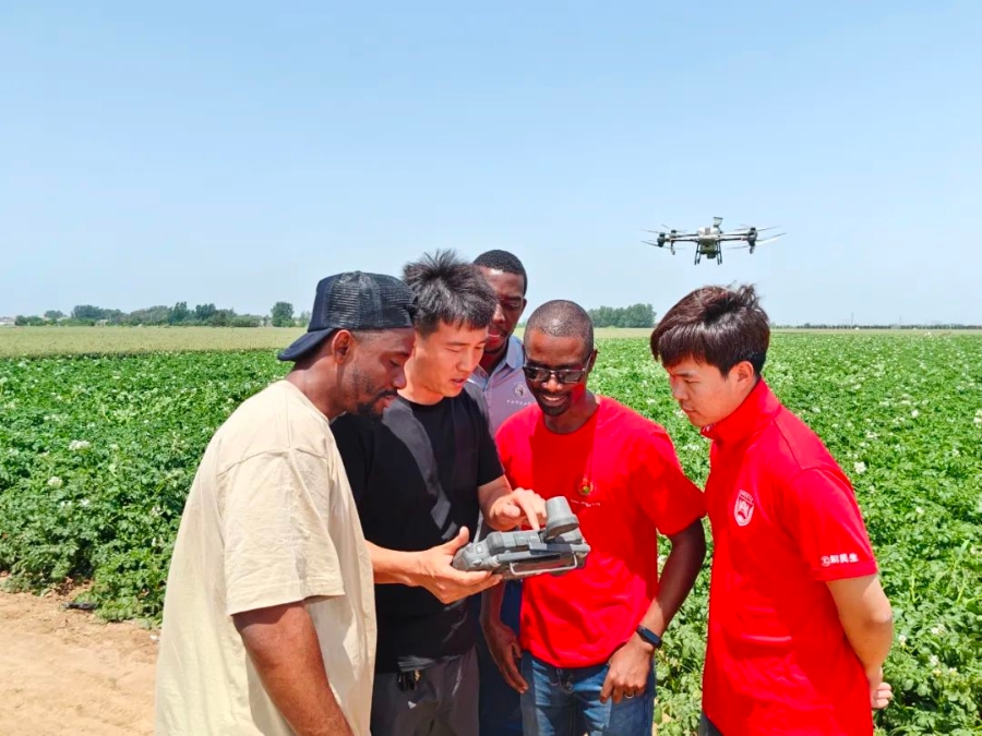 2024年5月13日,馬拉維籍留學(xué)生在河北曲周學(xué)習(xí)無人機飛防技術(shù)。 中新社發(fā) 中國農(nóng)業(yè)大學(xué) 供圖