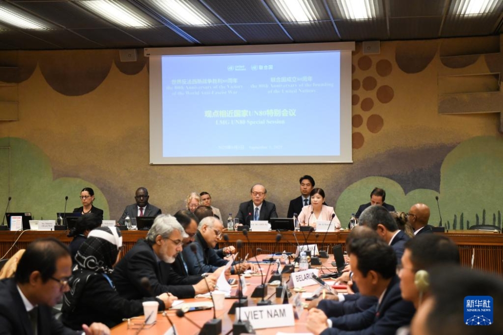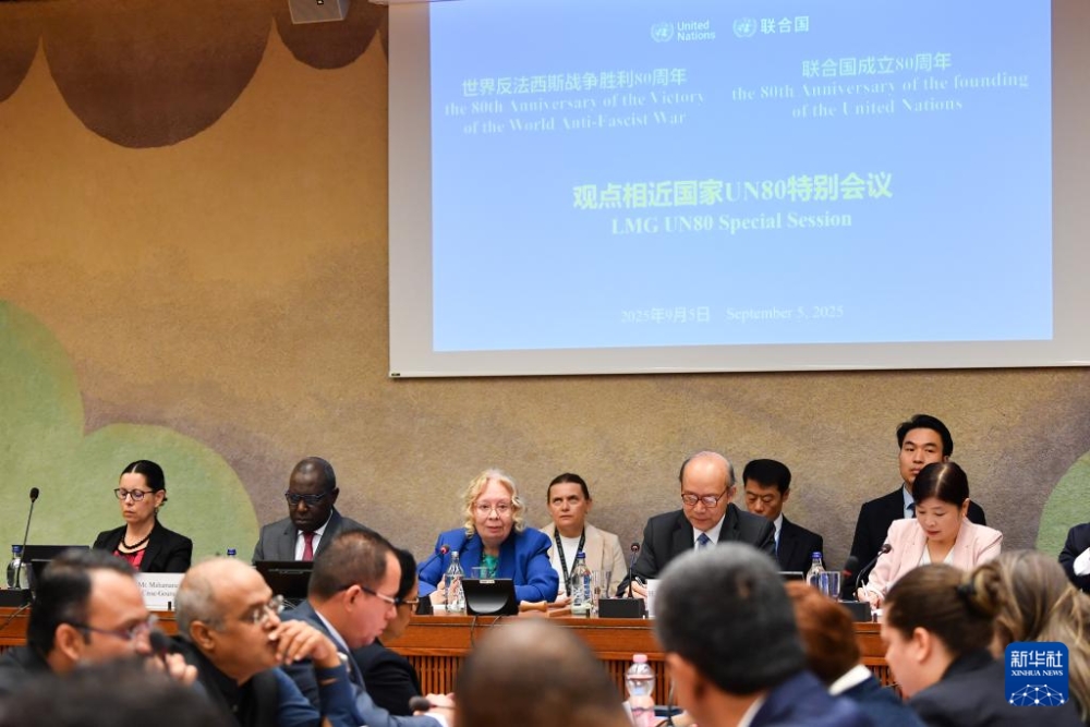 這是9月5日在瑞士日內(nèi)瓦萬(wàn)國(guó)宮拍攝的觀點(diǎn)相近國(guó)家聯(lián)合國(guó)成立80周年特別會(huì)議暨紀(jì)念世界反法西斯戰(zhàn)爭(zhēng)勝利80周年主題研討會(huì)現(xiàn)場(chǎng)。新華社記者 連漪 攝