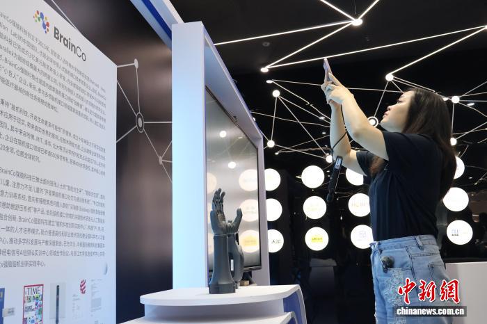 圖為參觀者打卡強(qiáng)腦科技的智能仿生手。中新社記者 鮑夢妮 攝
