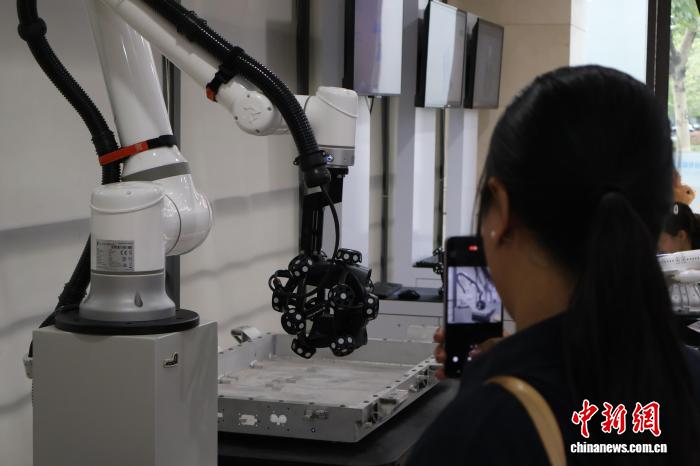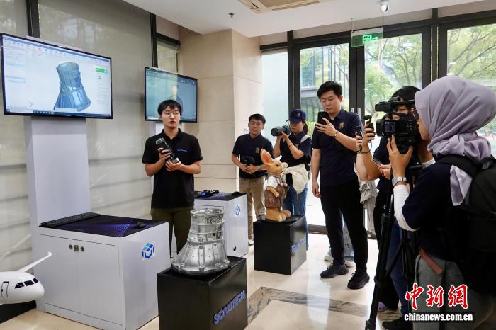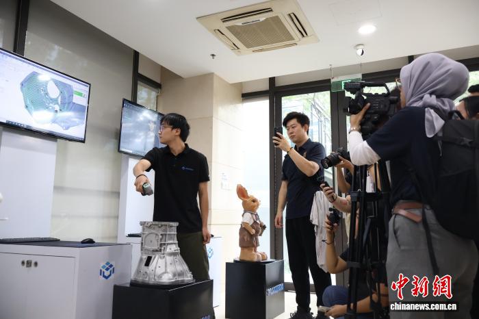 圖為工作人員向中外專家學(xué)者與媒體代表等介紹三維掃描儀技術(shù)。中新社記者 劉子琳 攝
