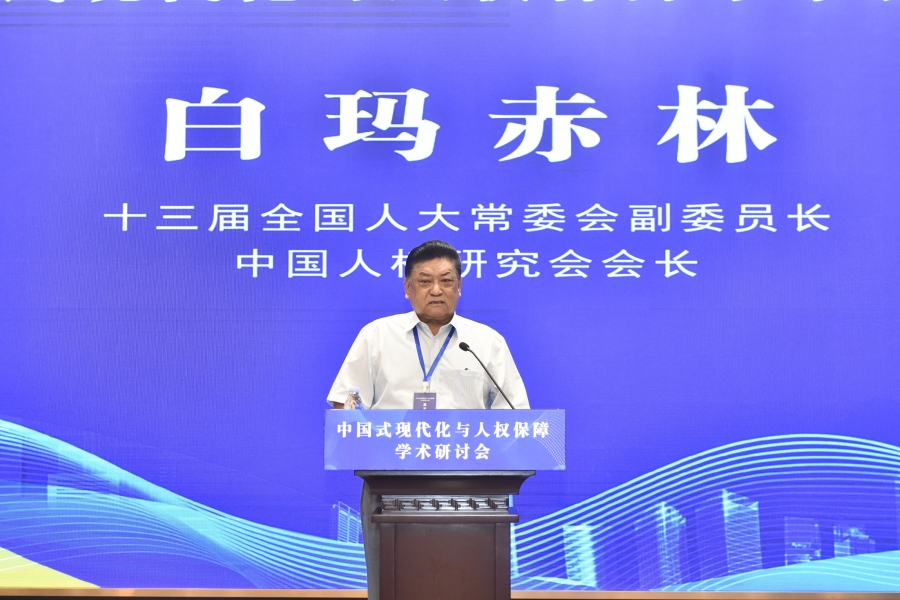 “中國式現(xiàn)代化與人權(quán)保障”學(xué)術(shù)研討會16日在山東濟南舉行。圖為十三屆全國人大常委會副委員長、中國人權(quán)研究會會長白瑪赤林在開幕式上致辭。主辦方供圖
