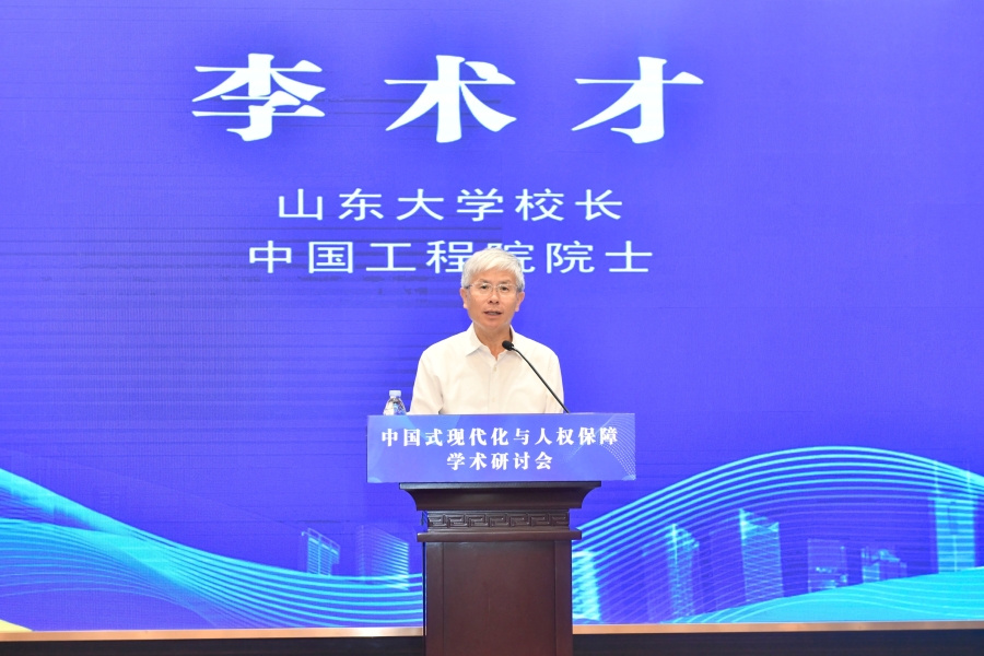 “中國式現(xiàn)代化與人權(quán)保障”學(xué)術(shù)研討會16日在山東濟南舉行。圖為山東大學(xué)校長、中國工程院院士李術(shù)才在開幕式上致辭。主辦方供圖