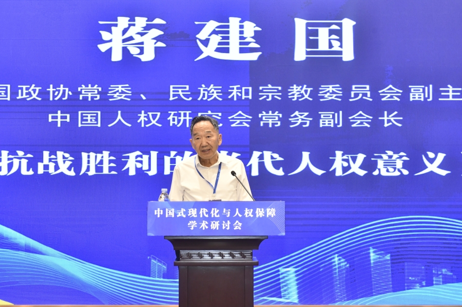 “中國(guó)式現(xiàn)代化與人權(quán)保障”學(xué)術(shù)研討會(huì)16日在山東濟(jì)南舉行。圖為全國(guó)政協(xié)常委、民族和宗教委員會(huì)副主任,中國(guó)人權(quán)研究會(huì)常務(wù)副會(huì)長(zhǎng)蔣建國(guó)作題為《抗戰(zhàn)勝利的當(dāng)代人權(quán)意義》的主旨演講。主辦方供圖