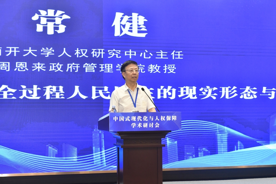 “中國(guó)式現(xiàn)代化與人權(quán)保障”學(xué)術(shù)研討會(huì)16日在山東濟(jì)南舉行。圖為南開大學(xué)人權(quán)研究中心主任、周恩來政府管理學(xué)院教授常健作題為《現(xiàn)代國(guó)家治理視域下全過程人民民主的現(xiàn)實(shí)形態(tài)與保障機(jī)制》的主旨演講。主辦方供圖