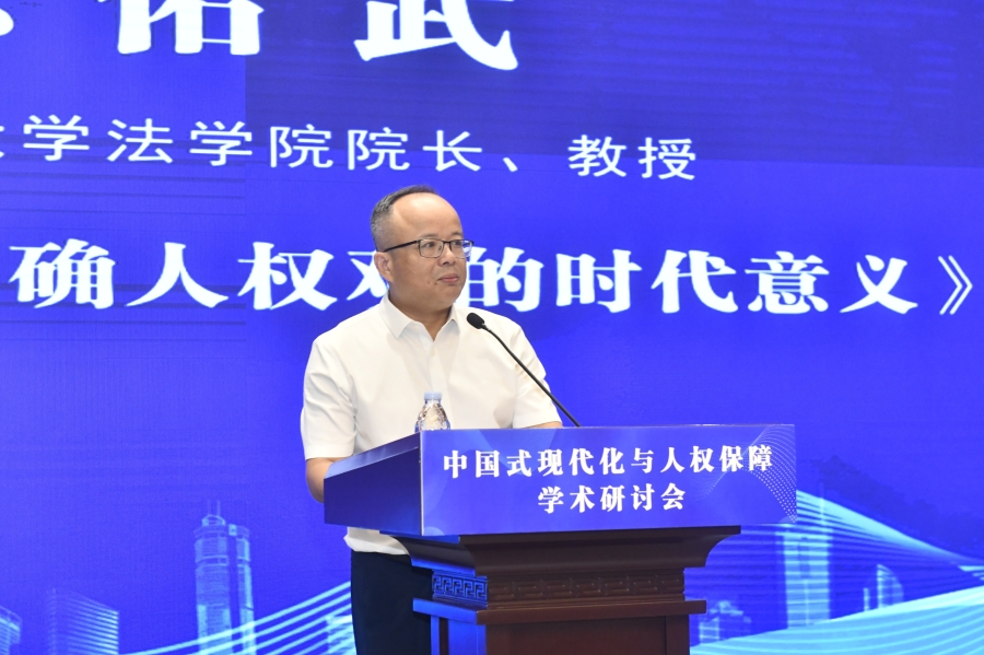 “中國(guó)式現(xiàn)代化與人權(quán)保障”學(xué)術(shù)研討會(huì)16日在山東濟(jì)南舉行。圖為廣東工業(yè)大學(xué)法學(xué)院院長(zhǎng)、教授陳佑武在“平行論壇(一)上半場(chǎng):中國(guó)式現(xiàn)代化進(jìn)程中的人權(quán)理論創(chuàng)新”作題為《堅(jiān)持和弘揚(yáng)正確人權(quán)觀的時(shí)代意義》的發(fā)言。主辦方供圖