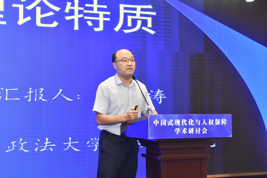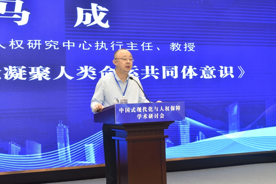“中國(guó)式現(xiàn)代化與人權(quán)保障”學(xué)術(shù)研討會(huì)16日在山東濟(jì)南舉行。圖為西北政法大學(xué)人權(quán)研究中心執(zhí)行主任、教授馬成在“平行論壇(一)上半場(chǎng):中國(guó)式現(xiàn)代化進(jìn)程中的人權(quán)理論創(chuàng)新”作題為《以國(guó)際愛(ài)國(guó)理念凝聚人類(lèi)命運(yùn)共同體意識(shí)》的發(fā)言。主辦方供圖