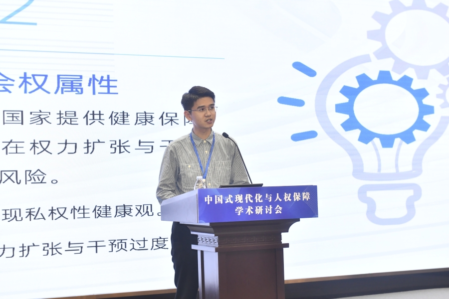“中國(guó)式現(xiàn)代化與人權(quán)保障”學(xué)術(shù)研討會(huì)16日在山東濟(jì)南舉行。圖為華東政法大學(xué)人權(quán)研究院助理研究員華毓中在“平行論壇(一)上半場(chǎng):中國(guó)式現(xiàn)代化進(jìn)程中的人權(quán)理論創(chuàng)新”作題為《作為發(fā)展權(quán)的健康權(quán)》的發(fā)言。主辦方供圖