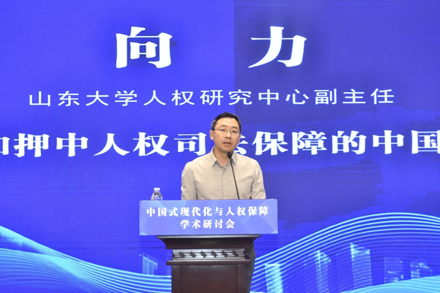 “中國(guó)式現(xiàn)代化與人權(quán)保障”學(xué)術(shù)研討會(huì)16日在山東濟(jì)南舉行。圖為山東大學(xué)人權(quán)研究中心副主任向力在“平行論壇(一)下半場(chǎng):中國(guó)式現(xiàn)代化進(jìn)程中的人權(quán)執(zhí)法司法保障”作題為《船舶扣押中人權(quán)司法保障的中國(guó)實(shí)踐》的發(fā)言。主辦方供圖