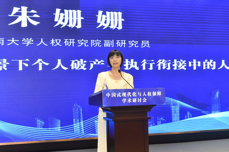 “中國(guó)式現(xiàn)代化與人權(quán)保障”學(xué)術(shù)研討會(huì)16日在山東濟(jì)南舉行。圖為東南大學(xué)人權(quán)研究院副研究員朱姍姍在“平行論壇(一)下半場(chǎng):中國(guó)式現(xiàn)代化進(jìn)程中的人權(quán)執(zhí)法司法保障”作題為《大力發(fā)展民營(yíng)經(jīng)濟(jì)背景下個(gè)人破產(chǎn)與執(zhí)行銜接中的人權(quán)保障》的發(fā)言。主辦方供圖