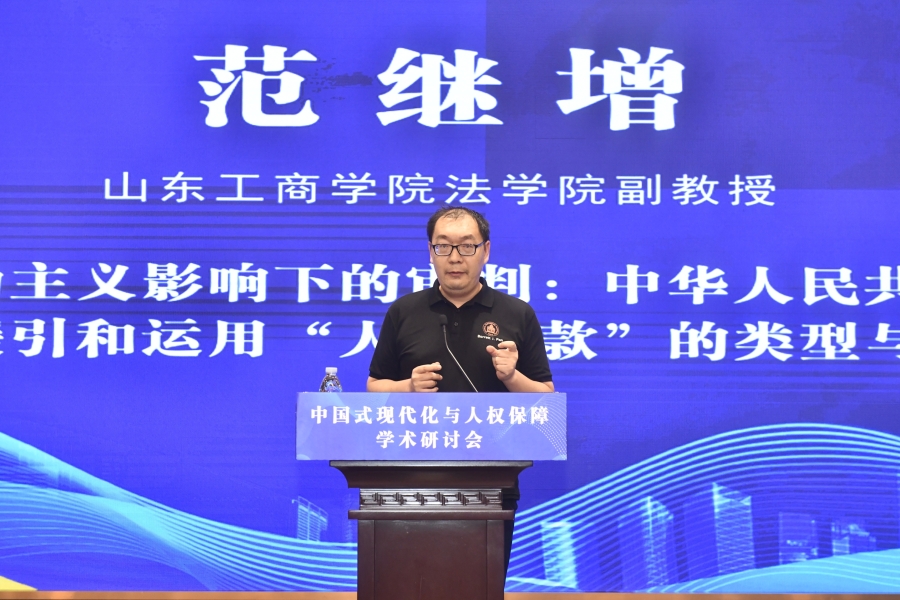 “中國(guó)式現(xiàn)代化與人權(quán)保障”學(xué)術(shù)研討會(huì)16日在山東濟(jì)南舉行。圖為山東工商學(xué)院法學(xué)院副教授范繼增在“平行論壇(一)下半場(chǎng):中國(guó)式現(xiàn)代化進(jìn)程中的人權(quán)執(zhí)法司法保障”作題為《司法能動(dòng)主義影響下的審判:中華人民共和國(guó)法院能動(dòng)性援引和運(yùn)用“人權(quán)條款”的類(lèi)型與評(píng)價(jià)》的發(fā)言。主辦方供圖