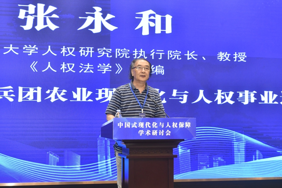 “中國(guó)式現(xiàn)代化與人權(quán)保障”學(xué)術(shù)研討會(huì)16日在山東濟(jì)南舉行。圖為西南政法大學(xué)人權(quán)研究院執(zhí)行院長(zhǎng)、教授、《人權(quán)法學(xué)》主編張永和作題為《新疆生產(chǎn)建設(shè)兵團(tuán)農(nóng)業(yè)現(xiàn)代化與人權(quán)事業(yè)進(jìn)步》的大會(huì)發(fā)言。主辦方供圖